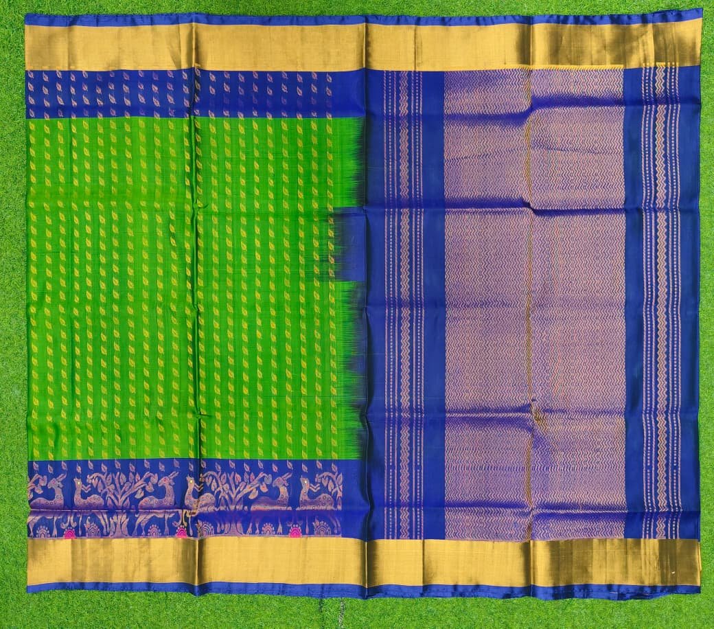 Saree Details: Pure Uppada Silk Saree Fabric | Authentic Pure Gold Zari Buta Motifs | Dual Skut Border Design (One Side Latha Zari, Other Side Plain Zari) | Rich Contrast Green Zari Pallu | Traditional Handloom Finish | Premium Craftsmanship