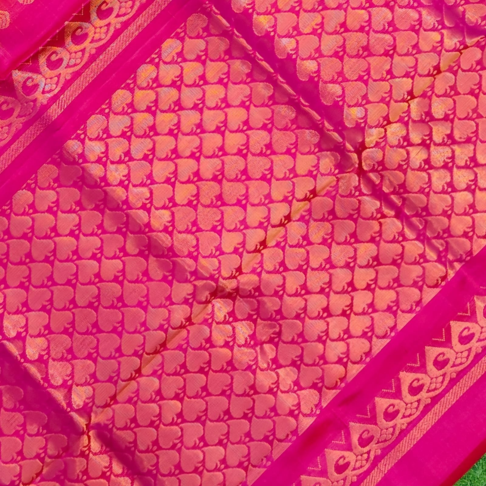 Saree Details: Pure Uppada Silk Saree Fabric | Authentic Pure Gold Zari Buta Motifs | Dual Skut Border Design (One Side Latha Zari, Other Side Plain Zari) | Rich Contrast Green Zari Pallu | Traditional Handloom Finish | Premium Craftsmanship
